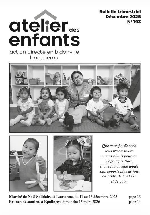 Atelier des Enfants est une association humanitaire suisse à but non lucratif, sans appartenance politique ni confessionnelle, qui a pour objectif général l’amélioration des conditions de vie des plus démunis parmi la population des bidonvilles de Lima, Pérou. Elle a été fondée en 1989 afin de soutenir financièrement et de faire connaître l’action de son association partenaire Taller de los Niños (TANI) fondée en 1978 par Christiane Ramseyer à Lima au Pérou. Dès l’origine, Atelier des Enfants a ainsi été le principal bailleur de fonds de TANI. Notre association récolte en Suisse les fonds nécessaires aux programmes sur le terrain, en assurant la promotion du travail réalisé au Pérou et en sensibilisant à la réalité de la vie des habitants des bidonvilles. Le comité d’Atelier des Enfants assure un dialogue permanent avec la direction de TANI à Lima afin de suivre les options stratégiques et l’évolution des programmes. Des visites de terrain ont lieu à intervalles réguliers.